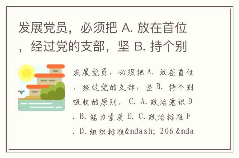 发展党员,必须把 A. 放在首位,经过党的支部,坚 B. 持个别吸收的原则。 C. A.政治意识 D. B.能力素质 E. C.政治标准 F. D.组织标准— 206 —