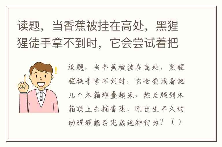 读题,当香蕉被挂在高处,黑猩猩徒手拿不到时,它会尝试着把几个木箱堆叠起来,然后爬到木箱顶上去摘香蕉。刚出生不久的幼猩猩能否完成这种行为?()