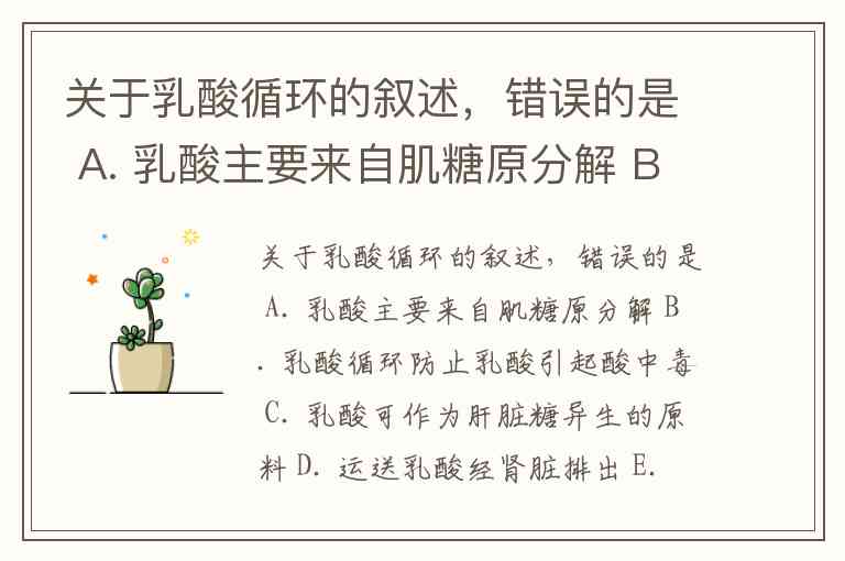 关于乳酸循环的叙述,错误的是 A. 乳酸主要来自肌糖原分解 B. 乳酸循环防止乳酸引起酸中毒 C. 乳酸可作为肝脏糖异生的原料 D. 运送乳酸经肾脏排出 E. 乳酸循环是耗能的过程