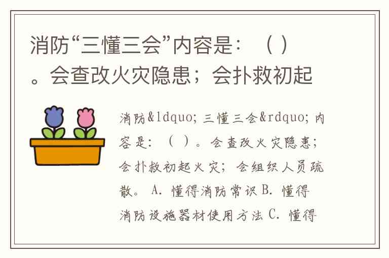 消防“三懂三会”内容是:( )。会查改火灾隐患;会扑救初起火灾;会组织人员疏散。 A. 懂得消防常识 B. 懂得消防设施器材使用方法 C. 懂得逃生技能 D. 懂得报告