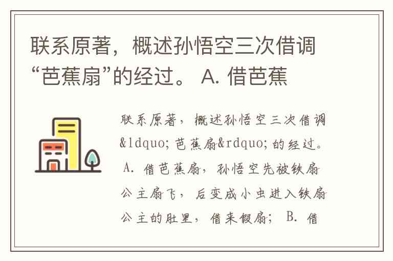 联系原著,概述孙悟空三次借调“芭蕉扇”的经过。 A. 借芭蕉扇,孙悟空先被铁扇公主扇飞,后变成小虫进入铁扇公主的肚里,借来假扇; B. 借芭蕉扇,孙悟空变成牛魔王得到真扇,又被牛魔王骗回 C. 借芭蕉扇,孙悟空请来天兵天将,降伏牛魔王,终于借到芭蕉扇。 D. 火烧红孩儿。