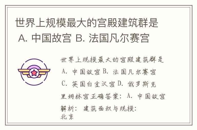 世界上规模最大的宫殿建筑群是 A. 中国故宫 B. 法国凡尔赛宫 C. 英国白金汉宫 D. 俄罗斯克里姆林宫