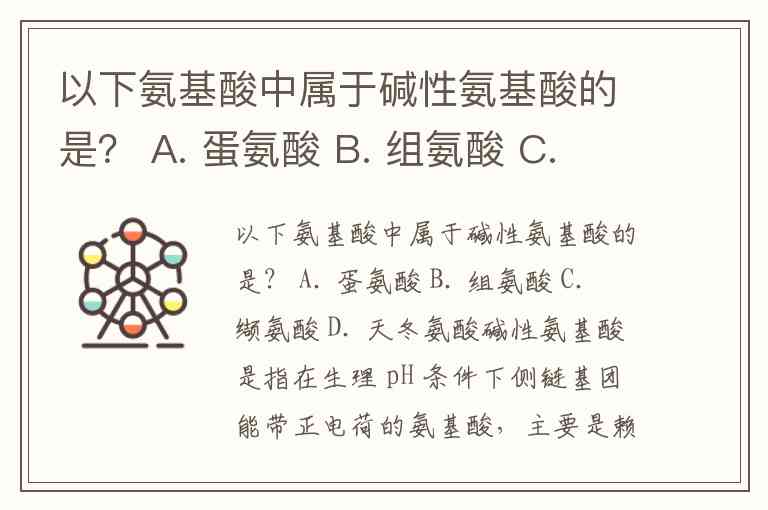 碱性氨基酸是指在生理 pH 条件下侧链基团能带正电荷的氨基酸,主要是赖氨酸、精氨酸、组氨酸。所以从选项中看: