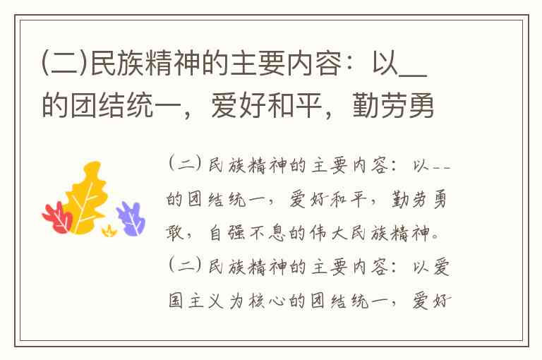 (二)民族精神的主要内容:以__的团结统一,爱好和平,勤劳勇敢,自强不息的伟大民族精神。