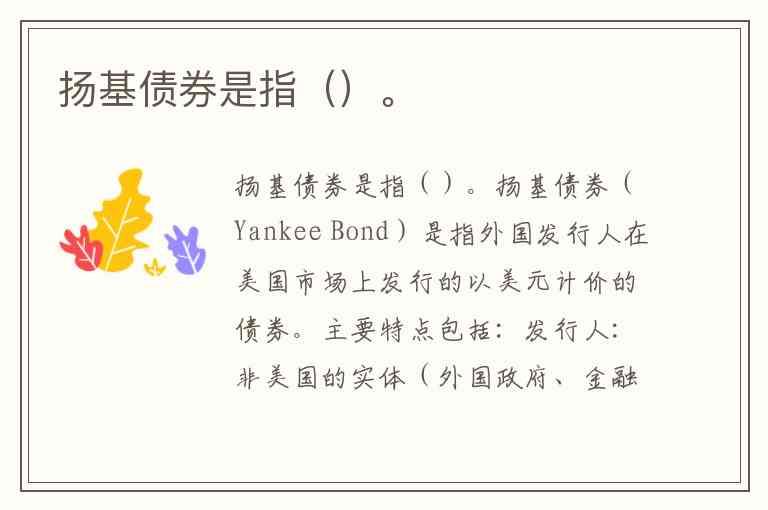 扬基债券(Yankee Bond)是指外国发行人在美国市场上发行的以美元计价的债券。