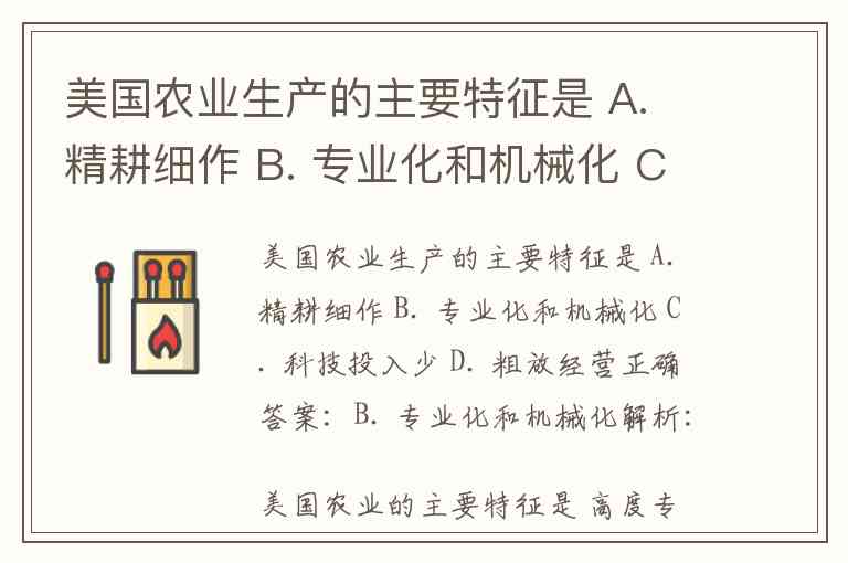 美国农业生产的主要特征是 A. 精耕细作 B. 专业化和机械化 C. 科技投入少 D. 粗放经营