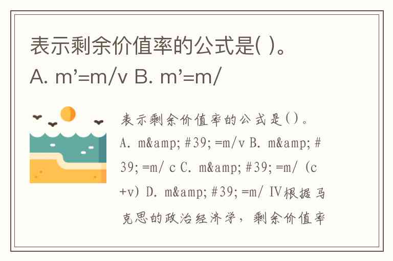 表示剩余价值率的公式是( )。 A. m'=m/v B. m'=m/ c C. m'=m/ (c+v) D. m'=m/ Ⅱ