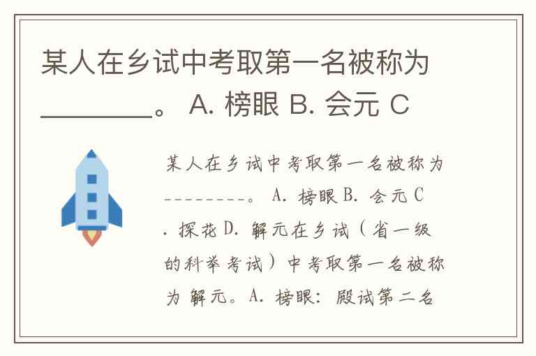 某人在乡试中考取第一名被称为________。 A. 榜眼 B. 会元 C. 探花 D. 解元