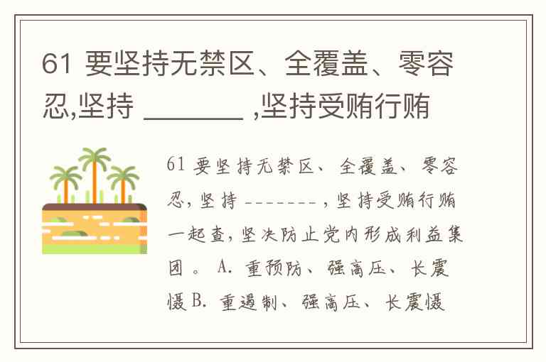 61 要坚持无禁区、全覆盖、零容忍,坚持 _______ ,坚持受贿行贿一起查,坚决防止党内形成利益集团 。 A. 重预防、强高压、长震慑 B. 重遏制、强高压、长震慑 C. 重遏制、不减压、长震慑 D. 重遏制、强高压、长威慑