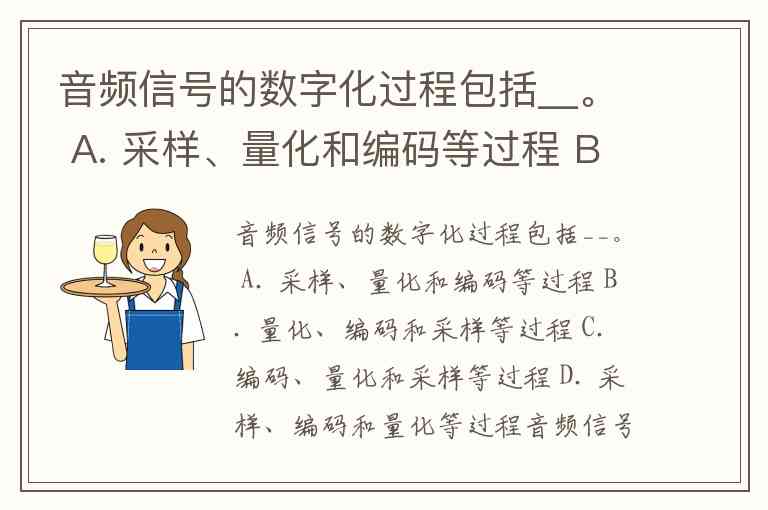 音频信号的数字化过程包括__。 A. 采样、量化和编码等过程 B. 量化、编码和采样等过程 C. 编码、量化和采样等过程 D. 采样、编码和量化等过程