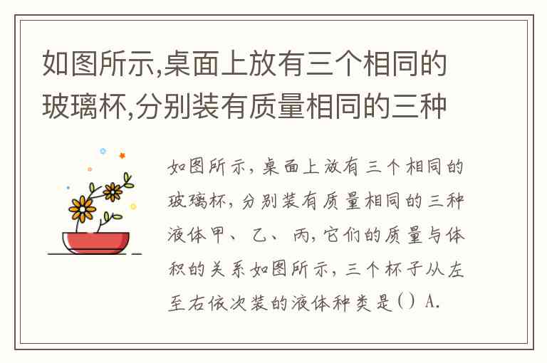 如图所示,桌面上放有三个相同的玻璃杯,分别装有质量相同的三种液体甲、乙、丙,它们的质量与体积的关系如图所示,三个杯子从左至右依次装的液体种类是( ) A. 乙、丙、甲 B. 甲、丙、乙 C. 甲、乙、丙 D. 丙、乙、甲