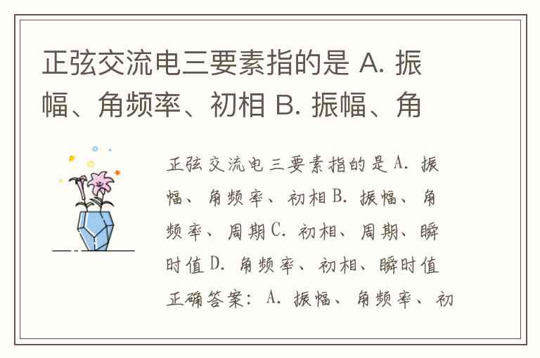 正弦交流电三要素指的是 A. 振幅、角频率、初相 B. 振幅、角频率、周期 C. 初相、周期、瞬时值 D. 角频率、初相、瞬时值