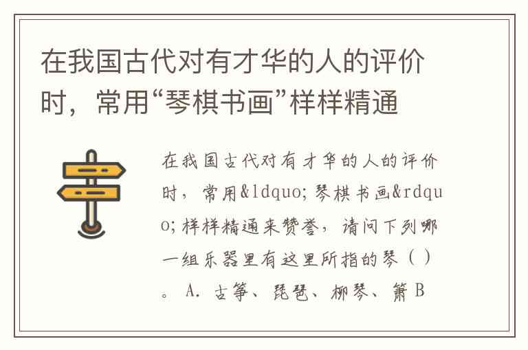 在我国古代对有才华的人的评价时,常用“琴棋书画”样样精通来赞誉,请问下列哪一组乐器里有这里所指的琴()。 A. 古筝、琵琶、柳琴、箫 B. 箫、扬琴、编钟 C. 二胡、古琴、琵琶、唢呐 D. 古筝、竖琴、二胡、唢呐