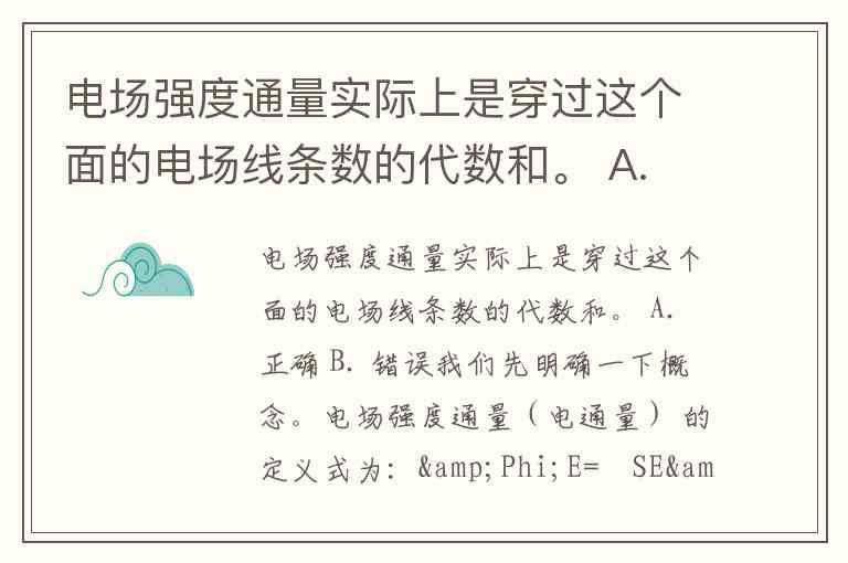 电场强度通量实际上是穿过这个面的电场线条数的代数和。 A. 正确 B. 错误