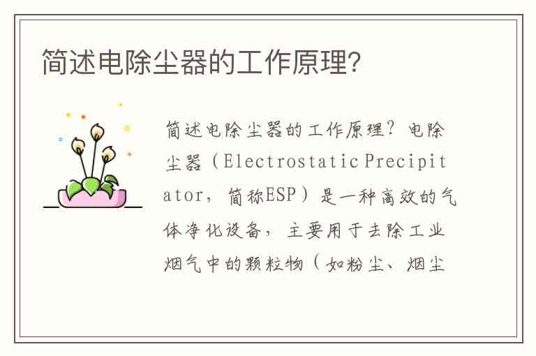 电除尘器(Electrostatic Precipitator,简称ESP)是一种高效的气体净化设备,主要用于去除工业烟气中的颗粒物(如粉尘、烟尘)。其工作原理基于静电吸附作用,核心过程可分为以下几个步骤: