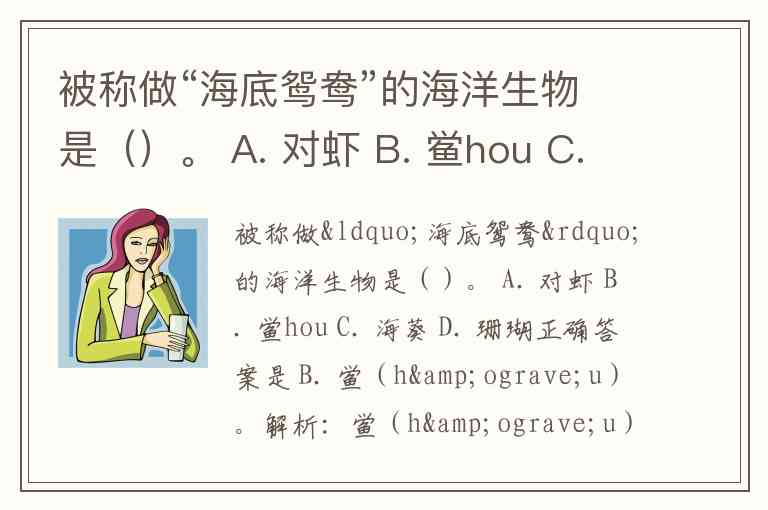 被称做“海底鸳鸯”的海洋生物是()。 A. 对虾 B. 鲎hou C. 海葵 D. 珊瑚