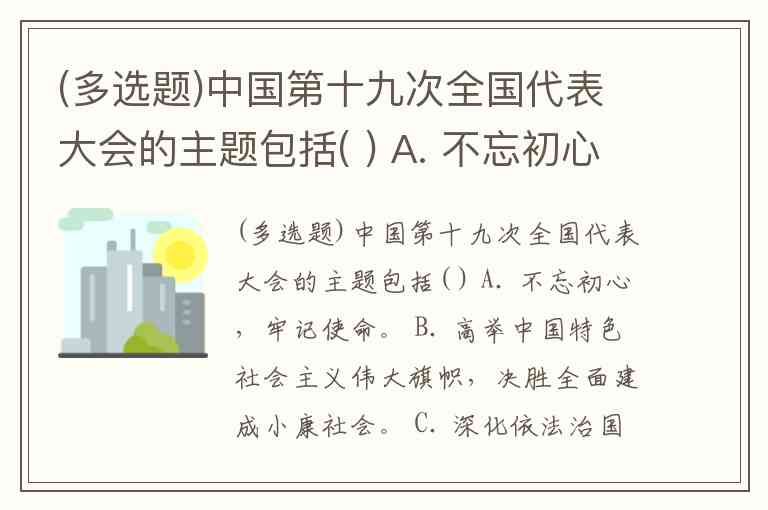 (多选题)中国第十九次全国代表大会的主题包括( ) A. 不忘初心,牢记使命。 B. 高举中国特色社会主义伟大旗帜,决胜全面建成小康社会。 C. 深化依法治国实践。 D. 夺取新时代中国特色社会主义伟大胜利。 E. 为实现中华民族伟大复兴的中国梦不懈奋斗。