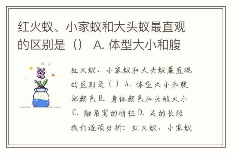 红火蚁、小家蚁和大头蚁最直观的区别是() A. 体型大小和腹部颜色 B. 身体颜色和头的大小 C. 触角窝的特征 D. 足的长短