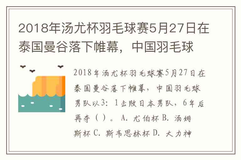 2018年汤尤杯羽毛球赛5月27日在泰国曼谷落下帷幕,中国羽毛球男队以3:1击败日本男队,6年后再夺()。 A. 尤伯杯 B. 汤姆斯杯 C. 斯韦思林杯 D. 大力神杯