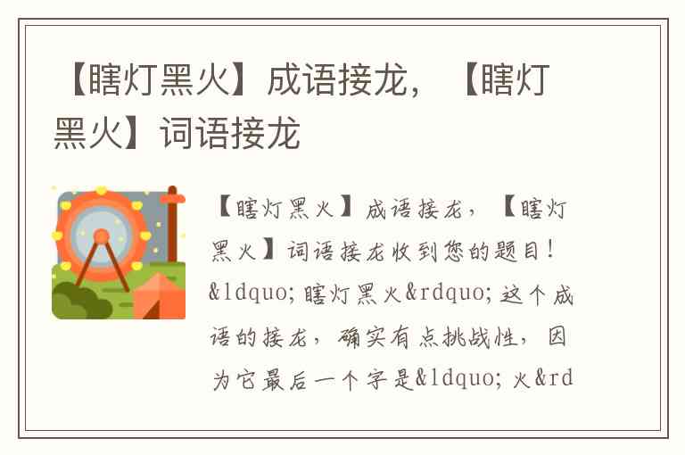 收到您的题目!“瞎灯黑火”这个成语的接龙,确实有点挑战性,因为它最后一个字是“火”。