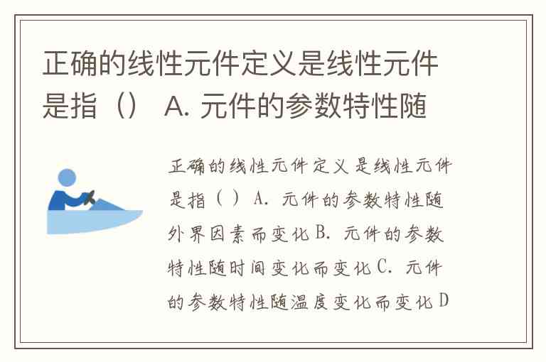正确的线性元件定义是线性元件是指() A. 元件的参数特性随外界因素而变化 B. 元件的参数特性随时间变化而变化 C. 元件的参数特性随温度变化而变化 D. 元件的参数特性不随外界因素而变化