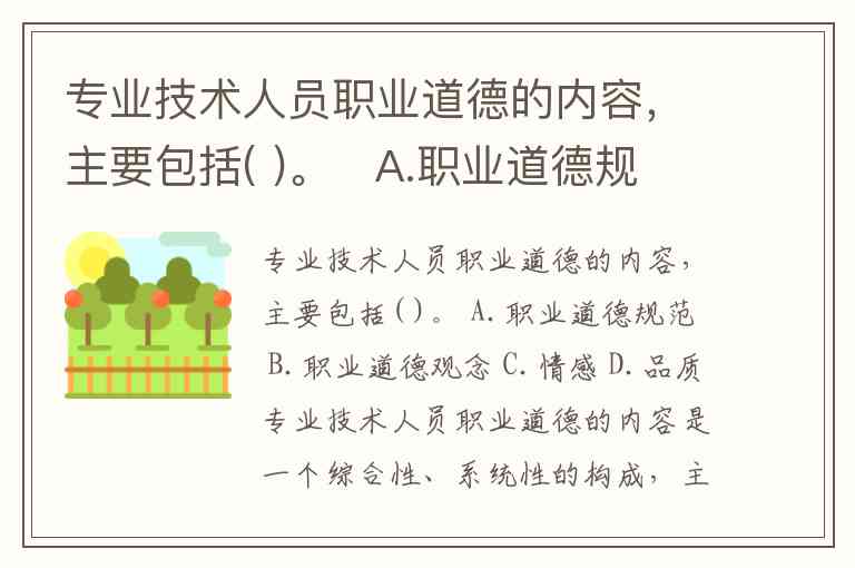 A. 职业道德规范:这是职业道德内容的核心和主体,是具体的行为准则和标准。它明确规定了专业技术人员在职业活动中“应该做什么”和“不应该做什么”。例如,各行业制定的执业准则、行为守则、诚信公约等,都属于具体的规范。