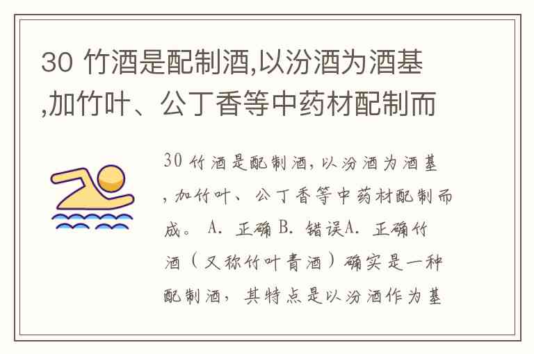 30 竹酒是配制酒,以汾酒为酒基,加竹叶、公丁香等中药材配制而成。 A. 正确 B. 错误