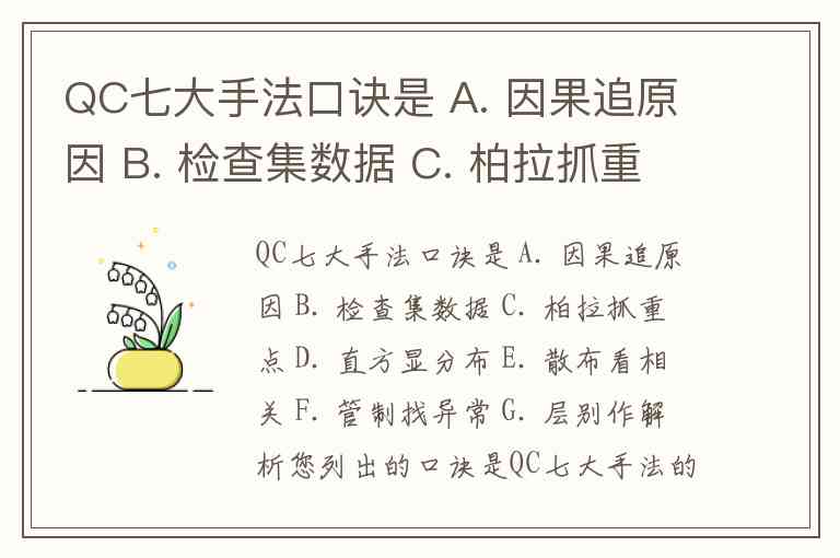 QC七大手法口诀是 A. 因果追原因 B. 检查集数据 C. 柏拉抓重点 D. 直方显分布 E. 散布看相关 F. 管制找异常 G. 层别作解析