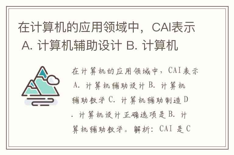 在计算机的应用领域中,CAI表示 A. 计算机辅助设计 B. 计算机辅助教学 C. 计算机辅助制造 D. 计算机设计