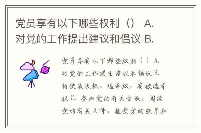 党员享有以下哪些权利() A. 对党的工作提出建议和倡议 B. 行使表决权、选举权,有被选举权 C. 参加党的有关会议,阅读党的有关文件,接受党的教育和培训 D. 在党的会议上和党报党刊上,参加关于党的政策问题的讨论