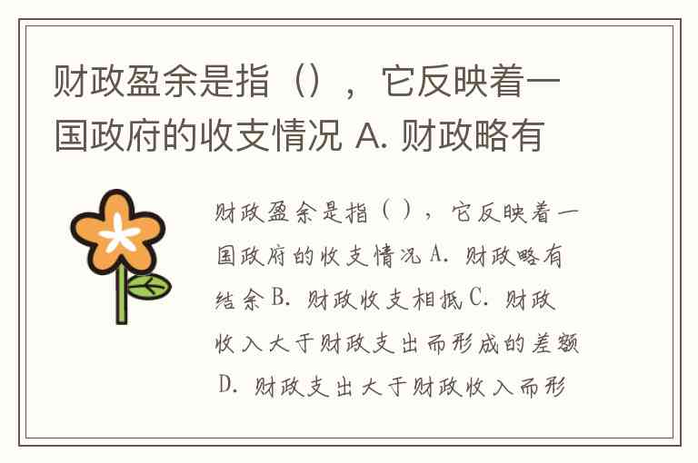 财政盈余是指(),它反映着一国政府的收支情况 A. 财政略有结余 B. 财政收支相抵 C. 财政收入大于财政支出而形成的差额 D. 财政支出大于财政收入而形成的差额