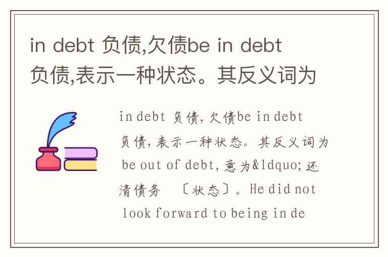 in debt 负债,欠债be in debt 负债,表示一种状态。其反义词为 be out of debt,意为“还清债务〞〔状态〕。He did not look forward to being in debt because his restaurant was no longer popular.他不希望由于餐馆不受欢送而负债。He was in debt when he was poor, but he has been out of debt since he got rich.他穷的时候欠了债,但自从富裕后就摆脱了债务。go / get / run into debt 负债〔表动作〕pay off the debt 还清债务〔强调结果〕pay back the debt 归还债务〔强调动作和过程〕owe a debt to sb. 欠某人的债be in one’s debt 欠某人的情The couple worked hard day and night in order to pay off all their debts.为了还清所有的债务,这对夫妇夜以继日地拼命干活。You saved my life; I am forever in your debt.你救了我的命,我永远感谢不尽。Lewis is in debt because he has purchased a new house.Lewis如今正欠着债,因为他刚刚买了个新房子。His company is deep in debt because of his bad management.他的公司由于经营不善而债台高筑。Many young people would like to have an expensive wedding even if they have to borrow a lot of money and be heavily __ after that. A. in trouble B. in surprise C. in love D. in debt