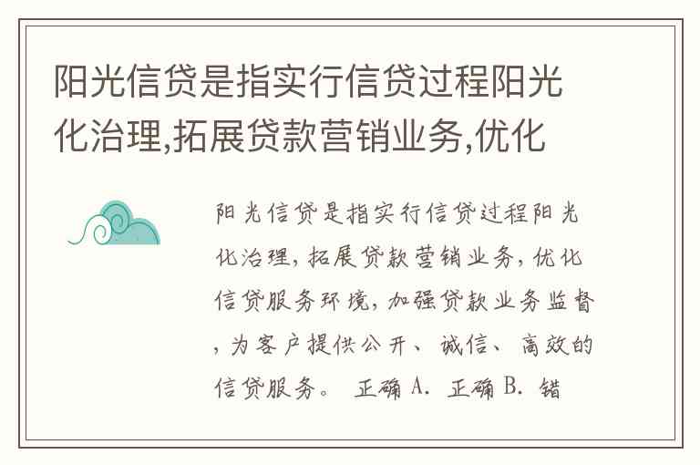 阳光信贷是指实行信贷过程阳光化治理,拓展贷款营销业务,优化信贷服务环境,加强贷款业务监督,为客户提供公开、诚信、高效的信贷服务。 正确 A. 正确 B. 错误