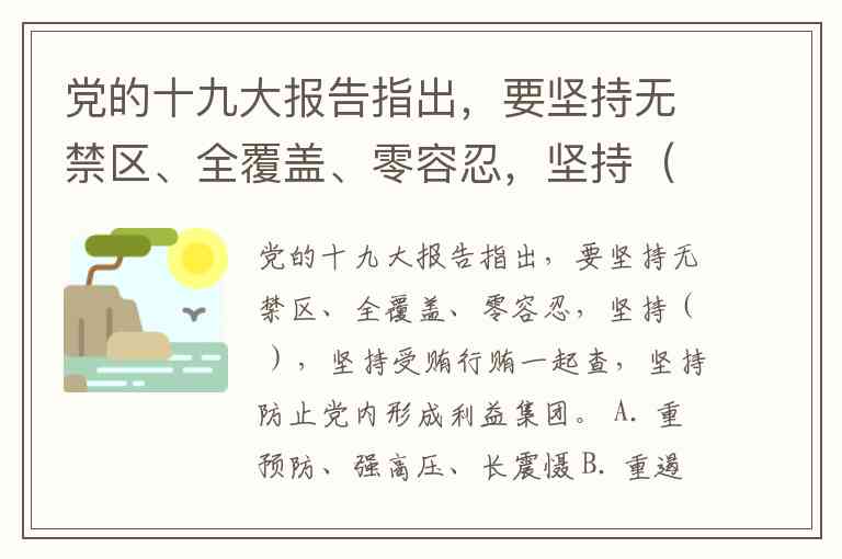 党的十九大报告指出,要坚持无禁区、全覆盖、零容忍,坚持( ),坚持受贿行贿一起查,坚持防止党内形成利益集团。 A. 重预防、强高压、长震慑 B. 重遏制、强高压、长威慑 C. 重遏制、不减压、长震慑 D. 重遏制、强高压、长震慑