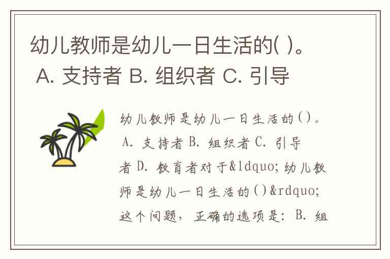 幼儿教师是幼儿一日生活的( )。 A. 支持者 B. 组织者 C. 引导者 D. 教育者