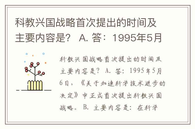 科教兴国战略首次提出的时间及主要内容是? A. 答:1995年5月6日,《关于加速科学技术进步的决定》中正式首次提出科教兴国战略。 B. 主要内容是:在科学技术是第一生产力思想的指导下,坚持教育为本,把科技和教育摆在经济。社会发展的重要位置,增强国家的科技实力及向现实生产力转化的能力,提高全民族的科技文化素质,把经济建设转移到依靠科技进步和提高劳动者素质的轨道上来,加逸实现国家的繁荣昌盛。