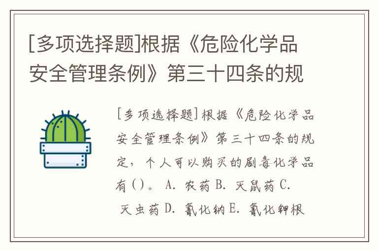 [多项选择题]根据《危险化学品安全管理条例》第三十四条的规定,个人可以购买的剧毒化学品有( )。 A. 农药 B. 灭鼠药 C. 灭虫药 D. 氰化钠 E. 氰化钾