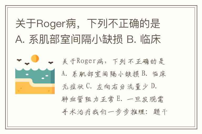 因为缺损小,多数情况下分流量小,不引起肺动脉高压,部分可随年龄自发闭合,多数无需手术,仅在部分有并发症(感染性心内膜炎风险相对增高,但不是所有患者都需要手术干预)时才考虑干预。因此“一旦发现需手术治疗”(E)不符合 Roger 病的现代处理原则。