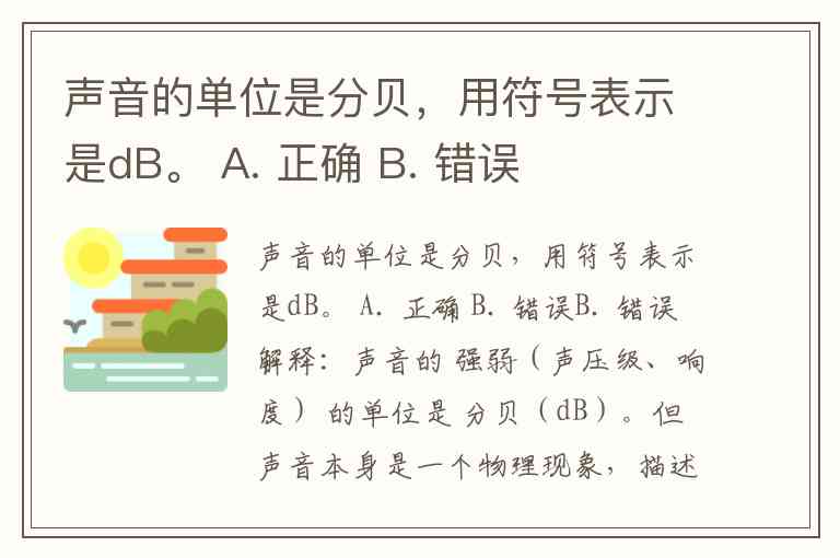 声音的单位是分贝,用符号表示是dB。 A. 正确 B. 错误