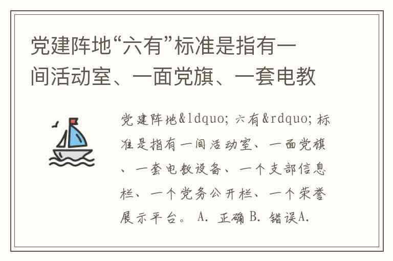 A. 正确党建阵地“六有”标准通常包括:有一间活动室、一面党旗、一套电教设备、一个支部信息栏、一个党务公开栏、一个荣誉展示平台。这些要素旨在规范基层党组织的活动场所建设,提升党建工作的规范化和实效性。