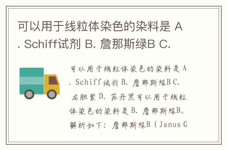 可以用于线粒体染色的染料是 A. Schiff试剂 B. 詹那斯绿B C. 龙胆紫 D. 苏丹黑