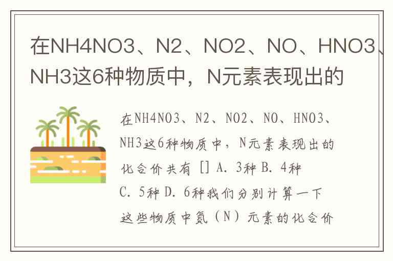 在NH4NO3、N2、NO2、NO、HNO3、NH3这6种物质中,N元素表现出的化合价共有 [] A. 3种 B. 4种 C. 5种 D. 6种