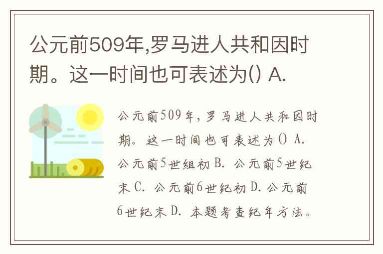 公元前509年,罗马进人共和因时期。这一时间也可表述为() A. 公元前5世组初 B. 公元前5世纪末 C. 公元前6世纪初 D.公元前6世纪末 D. 本题考查纪年方法。"公元前509年"按"世纪"纪年应为"公元前6世纪末",D项正确。
