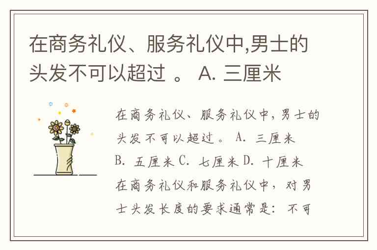 在商务礼仪、服务礼仪中,男士的头发不可以超过 。 A. 三厘米 B. 五厘米 C. 七厘米 D. 十厘米
