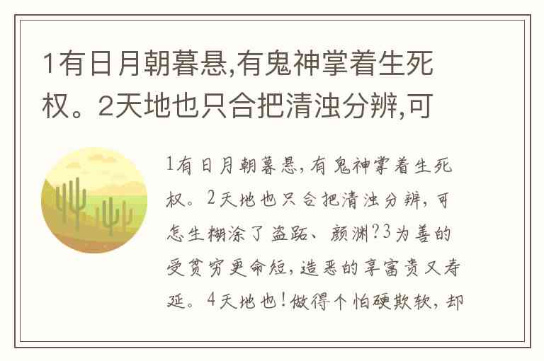 1有日月朝暮悬,有鬼神掌着生死权。2天地也只合把清浊分辨,可怎生糊涂了盗跖、颜渊?3为善的受贫穷更命短,造恶的享富贵又寿延。4天地也!做得个怕硬欺软,却原来也这般顺水推船!5地也,你不分好歹何为地!6天也!你错勘贤愚枉做天!7哎,只落得两泪涟涟。 A. 第一句是说人的生死全有鬼神掌握着,谁该生,谁该死,如日月分明。 B. 第二句用设问询问天地为什么混淆了盗跖、颜渊,第三句用对比揭示不公平的社会现状。第四句指出这种状况是天地“怕硬欺软,顺水推船”、不敢坚持正义造成的。 C. 第五、六句愤怒谴责天地失掉职分就不该“为地”、“做天”,为后面“天地”被窦娥冤情感动,使其实现三大誓愿做的反衬。 D. 第七句窦娥面对法制黑暗的现实,无法伸冤,只感到无限委屈和悲伤。