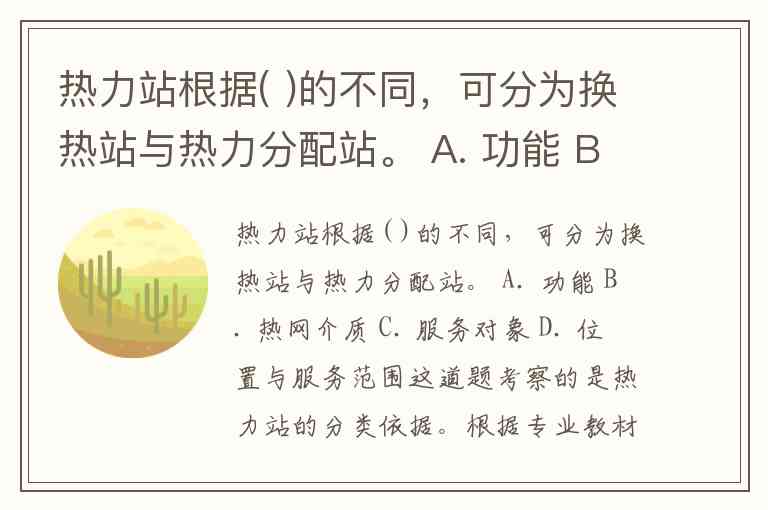 热力站根据( )的不同,可分为换热站与热力分配站。 A. 功能 B. 热网介质 C. 服务对象 D. 位置与服务范围