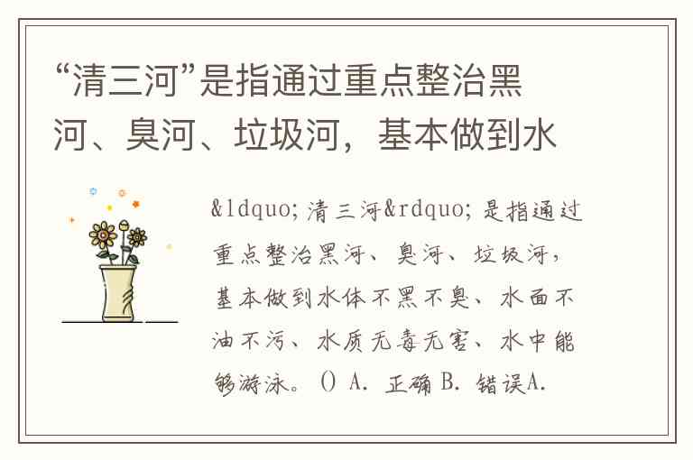 “清三河”是指通过重点整治黑河、臭河、垃圾河,基本做到水体不黑不臭、水面不油不污、水质无毒无害、水中能够游泳。() A. 正确 B. 错误