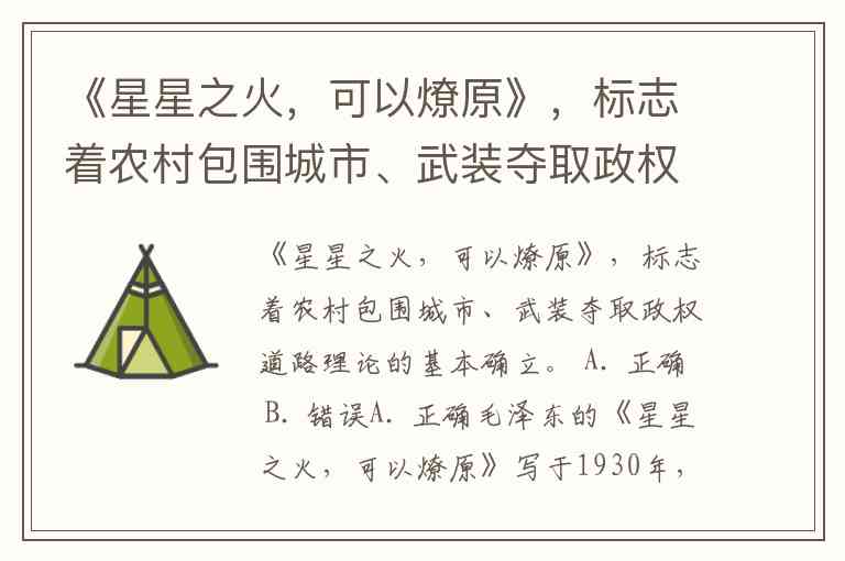 《星星之火,可以燎原》,标志着农村包围城市、武装夺取政权道路理论的基本确立。 A. 正确 B. 错误