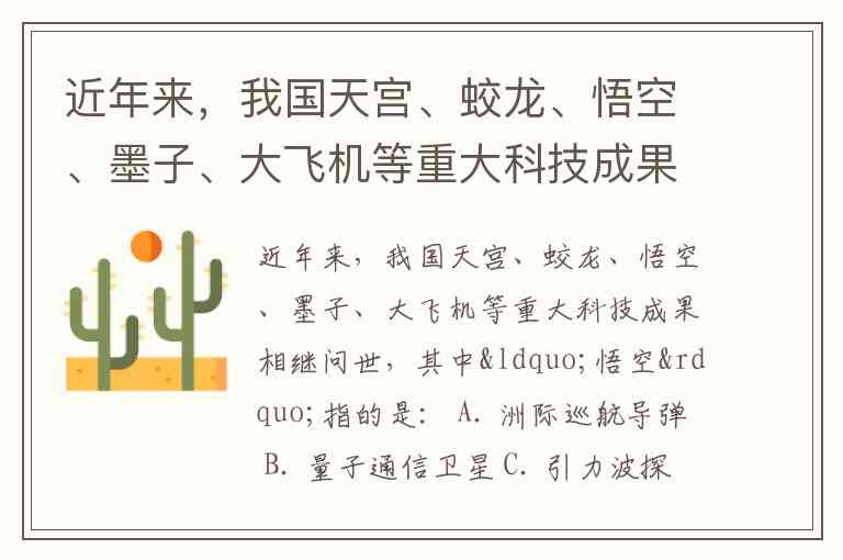 近年来,我国天宫、蛟龙、悟空、墨子、大飞机等重大科技成果相继问世,其中“悟空”指的是: A. 洲际巡航导弹 B. 量子通信卫星 C. 引力波探测卫星 D. 暗物质粒子探测卫星