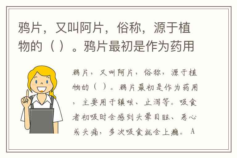 鸦片,又叫阿片,俗称,源于植物的( )。鸦片最初是作为药用,主要用于镇咳、止泻等。吸食者初吸时会感到头晕目眩、恶心或头痛,多次吸食就会上瘾。 A. 花蕊 B. 蒴果 C. 根 D. 茎和叶